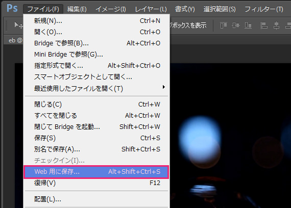 メニューバーのファイルから【Web用に保存】を選択します。