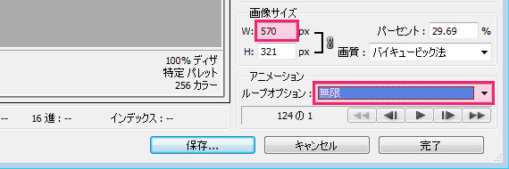 動画のサイズが大き過ぎるとデータも重くなってしまうので、ブログ記事などにGIFアニメーションを貼りたい場合には、適切なサイズ(ここではブログのカラムサイズと同じ570px)に調整し、ループオプションは【無限】にして保存します。